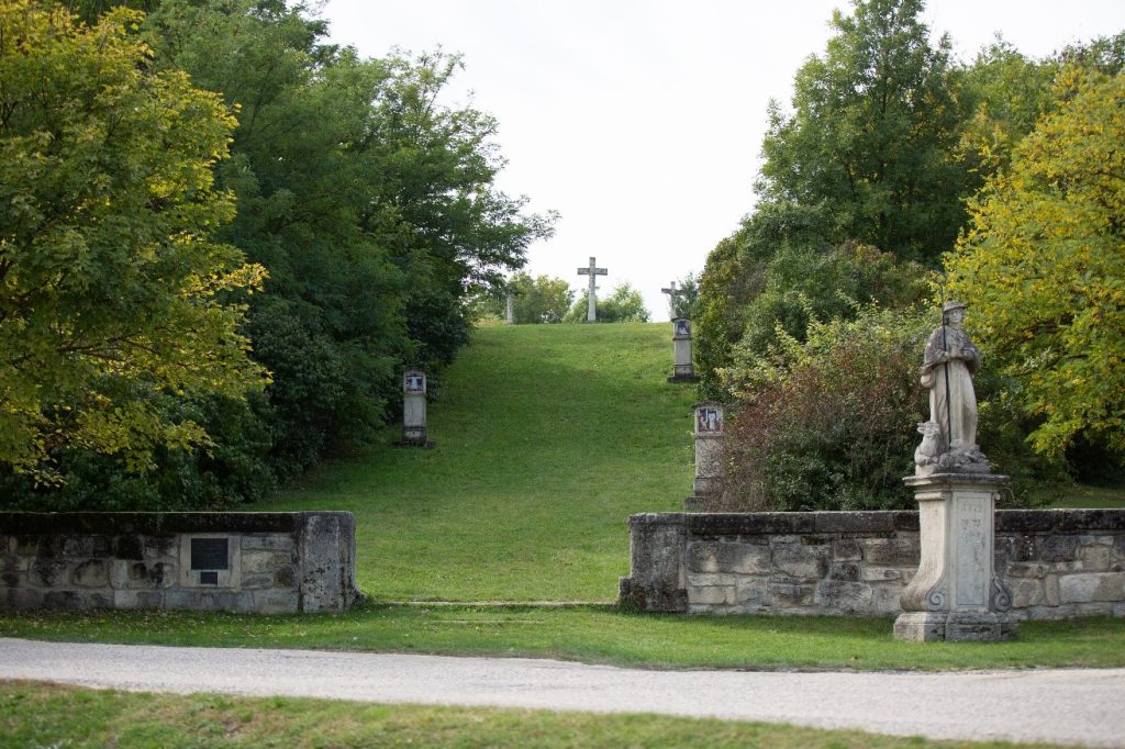 A kálvária elrendezésére jellemző, hogy a domb jobb alsó részéből induló stációsor a dombra fölérve körben megkerüli a feszületeket, majd jobb oldalon visszatér. A mintegy 150 cm magas mészkő pilléreket mozaikképek díszítik. A domb tetején kőtalapzaton alakos kőfeszületek állnak. A középső magasabb kereszt talapzatán vőrösmészkő feliratos tábla alatt az eredeti (olvashatatlanná erodált) felirat áll.